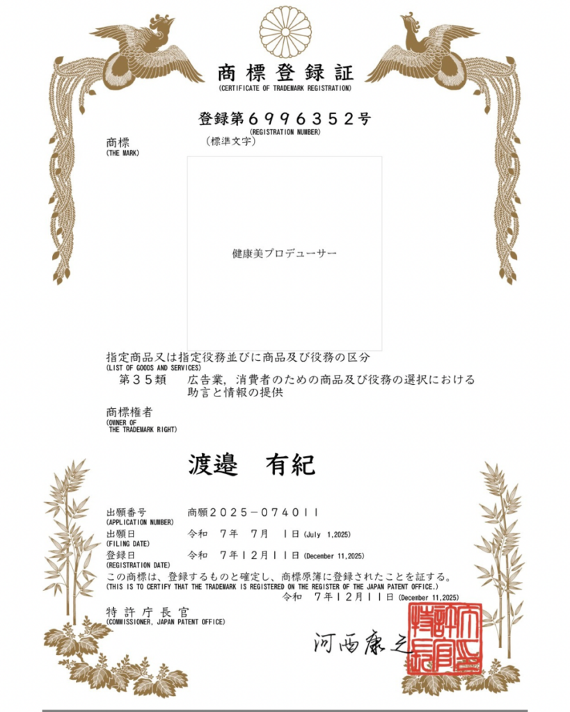 健康美プロデューサー®商標登録されました 健康美ニュース X Facebook はてブ LINE Pinterest コピー 2025.12.232026.01.07 令和7年12月11日「健康美プロデューサー®」が商標登録されました。 引き続き、渡邉有紀は健康美を発信してまいります。 よろしくお願いいたします。